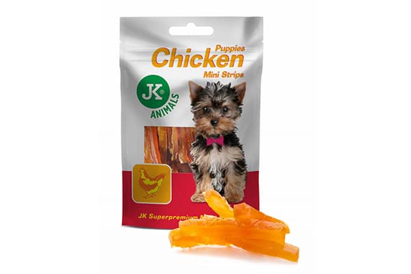 • kleine getrocknete Hühnerfleischsteifen für Welpen