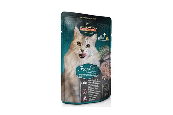 Lachs (30 %); Brühe vom Hering, Lachs, Shrimps (28,8 %); Hering (18 %); Shrimps (12 %); Geflügelleber (10 %); Eierschalen, getrocknet (0,5 %); Mineralstoffe (0,5 %); Lachsöl (0,2 %)