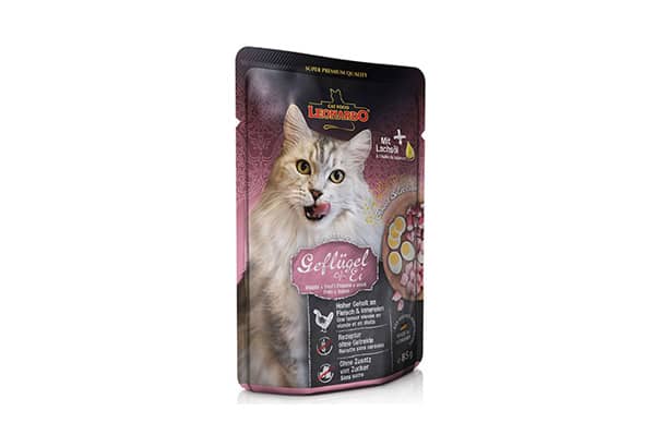 Geflügelfleisch, -herz, -leber (60 %); Fleischbrühe von Geflügel, Rind (28,3 %); Rinderlunge (6,5 %); Vollei (4 %); Eierschalen, getrocknet (0,5 %); Mineralstoffe (0,5 %); Lachsöl (0,2 %)