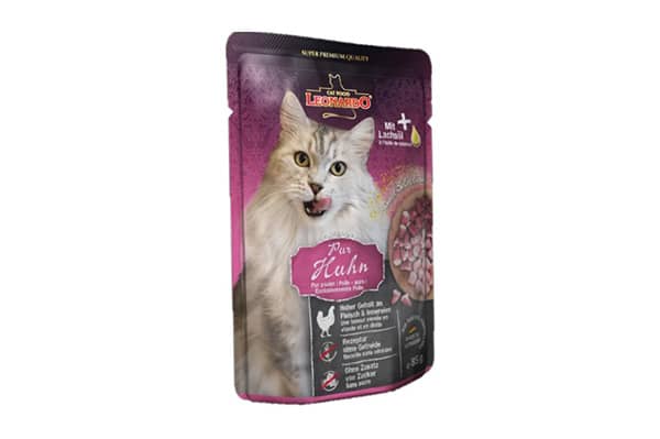 Hühnerfleisch, -herz, -leber, -muskelmagen (70 %); Fleischbrühe vom Huhn (28,8 %); Eierschalen, getrocknet (0,5 %); Mineralstoffe (0,5 %); Lachsöl (0,2 %)