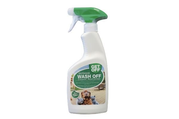 GET OFF Outdoor Wash off – Cleaner Neutraliser Spray eignet sich zur Anwendung in Haus und Garten, um Hunde und Katzen davon abzuhalten, Flächen wie z.B. Türen, Pfosten u.Ä. zu beschmutzen oder zu beschädigen.