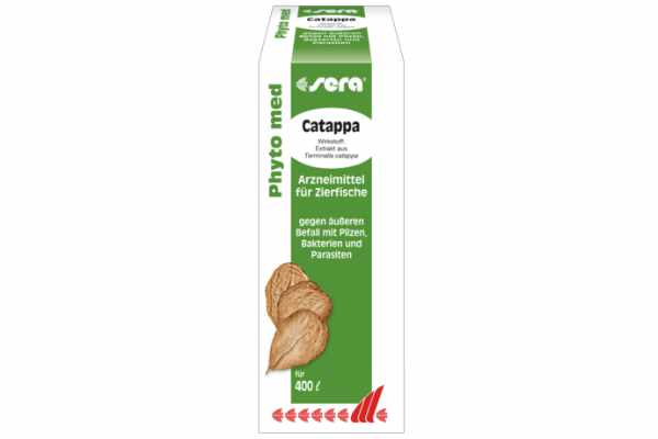 Das pflanzliche Arzneimittel sera Phyto med Catappa enthält als Wirkstoff einen Extrakt aus Seemandelbaumblättern (Terminalia catappa) gegen Pilze, Bakterien und Ektoparasiten. Es ist das erste Medikament für die Aquaristik auf Basis von Catappablättern. Durch das neue, einzigartige von sera entwickelte Extraktionsverfahren wird das Maximum der medizinisch wirksamen Substanzen aus den Blättern gelöst. sera Phyto med Catappa wirkt durch den speziellen Wirkstoffvermittler schneller. Im Vergleich mit normalen Extrakten oder der reinen Zugabe von Catappablättern wirkt sera Phyto med Catappa bis zu 10 Mal stärker.